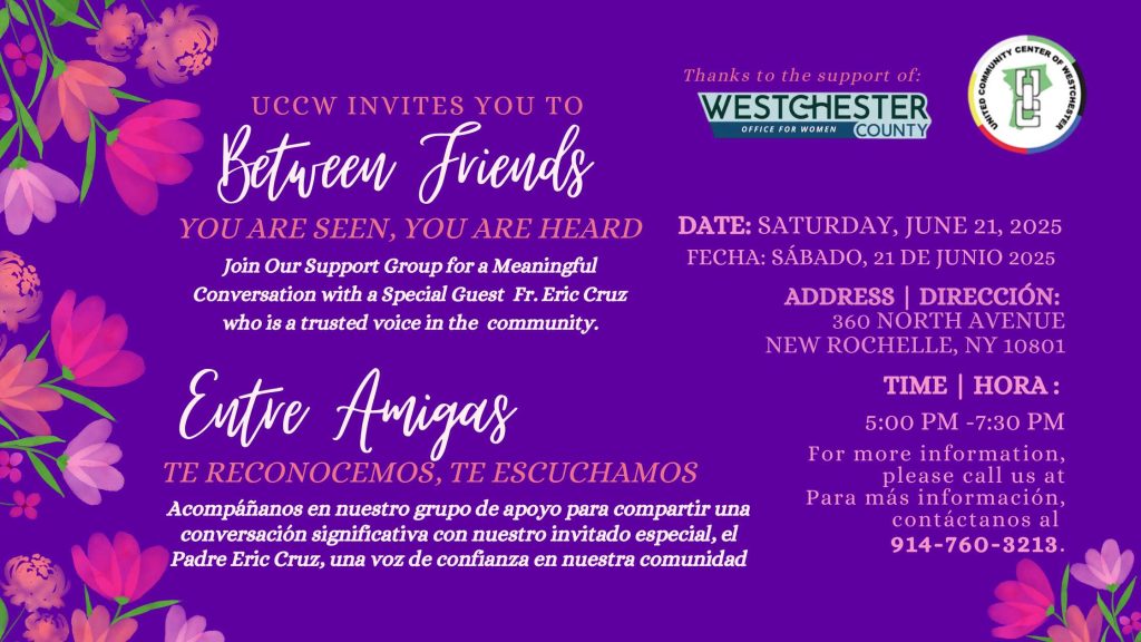 En UCCW creemos que todos merecen ser vistos y escuchados. Te invitamos a nuestro grupo de apoyo Entre Amigas para compartir una tarde significativa de conversación, conexión y cuidado comunitario. Nos honra recibir al Padre Eric Cruz, una voz respetada y un defensor incansable de nuestra comunidad, quien compartirá palabras de sabiduría, guía e inspiración. Este es un espacio seguro y acogedor para escuchar, compartir y fortalecernos juntos.